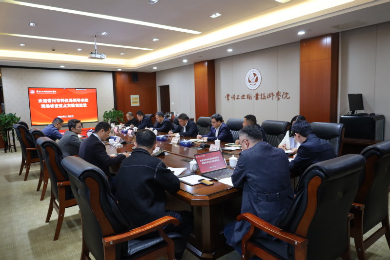 11月6日,常州市科技局平台机构处处长薛晔、主任科员高志伟来校调研常州市重点实验室建设情况。党委书记席海涛、相关部门负责人以及实验室共建单位中机寰宇认证检验股份有限公司智改数转总监李飞参加调研会。