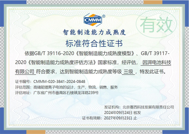 2024年9月13日,因湃电池智能制造能力成熟度(CMMM)三级证书公示,因湃成为锂电行业内首家全子域全条款通过的认证企业。因湃电池围绕产品及工艺数字化设计、产线柔性配置、车间智能排产、物流精准配送、智能视觉检测、质量精准追溯等重点场景赋能,基于云原生架构和虚拟工厂,构建了数据驱动的智能生产环境,实现了从设计到生产的全流程数字化映射,让运营效率整体提升30%,综合能耗降低30%,研发/工艺迭代速度提升20%,成为智慧工厂新标杆。