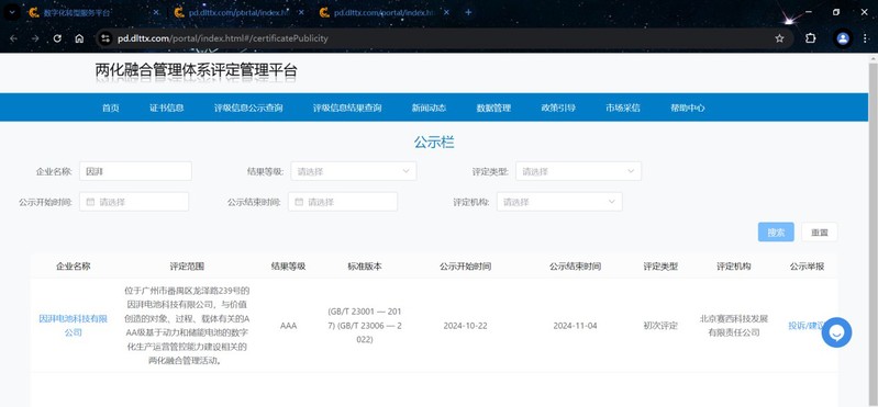 10月22日,因湃电池科技有限公司两化融合管理体系(AAA级)认证证书在官方平台公示,这标志着数字化创新研究院主导、江苏网泰公司联合承担的广汽因湃电池智能制造认证项目(一期)圆满交付。