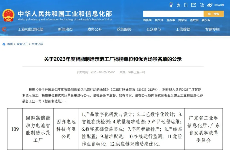 2023年10月26日,工业和信息化部发布了《关于2023年度智能制造示范工厂揭榜单位和优秀场景名单的公示》,因湃电池科技有限公司入选2023年度智能制造示范工厂揭榜单位。因湃电池成为国内唯一一家拥有主机厂背景,并且申请动力+储能电池示范工厂成功的企业、这一荣誉标志着因湃电池在智能制造领域取得了国家级的认可。